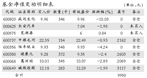 热股方面,昨日威远生化因1182万股大非解禁而跌停,显示了市场对大小非的恐惧,由于盘中跌幅逾3%,本栏按计划在9.96元买进。其他因盘中跌幅逾3%而让本栏买到的热股还有恒丰纸业、健康元、葛洲坝和城投控股。今日计划:若有热股盘中涨逾3%,予以逢高沽出。