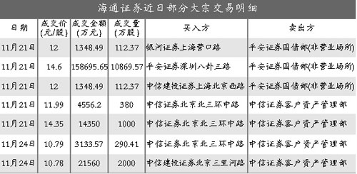 11月24日,海通继续第二个跌停,在场外进行的3笔大宗交易中,以当日跌停价10.78元共计成交2048.4万股,10.79元成交290.41万股。而在当日的场内A股交易中,全日被超过2亿股卖单封死跌停,成交量仅有530.27万股。11月25日,海通证券发生了一笔大宗交易,以9.7元成交了40.34万股。