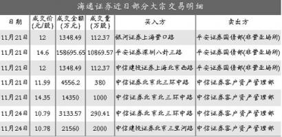 上交所公开信息显示,11月25日中信建投证券北京三里河路营业部通过二级市场累计卖出1.44亿元,而这家营业部在前一日刚刚通过大宗交易市场买入2.16亿元;以14.35元在大宗交易市场上高价接盘的中信证券北京北三环中路营业部则在11月21日~25日三个交易日内卖出8672万元,显然都是急于甩掉海通证券这个烫手山芋,但已经在短短几天内遭受巨大损失。