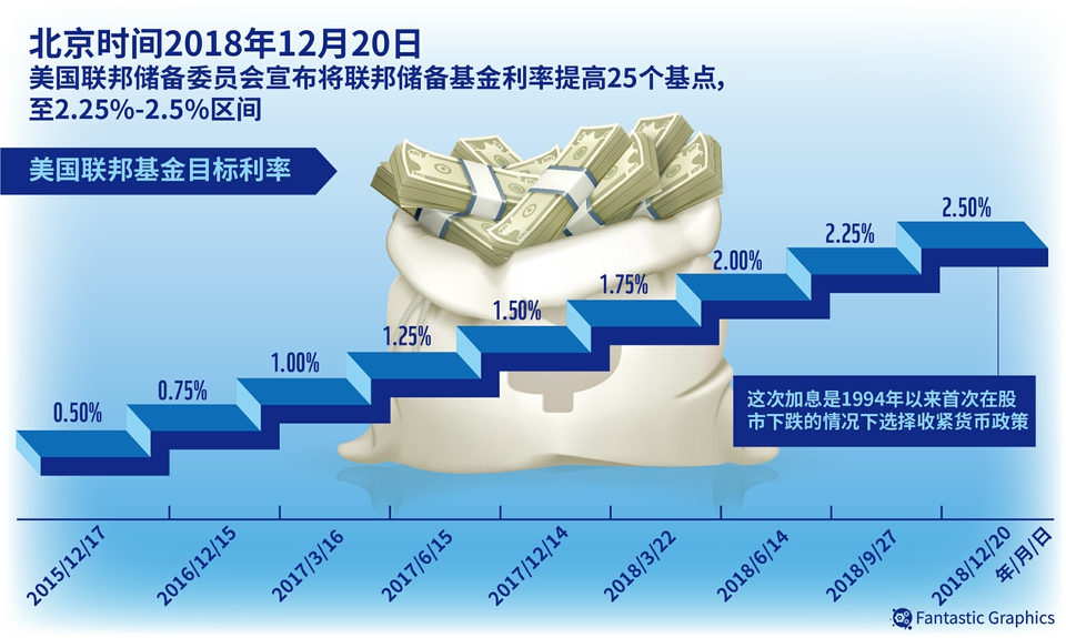 北京时间12月20日凌晨3点,美联储宣布,考虑到当前以及预期的劳动力市场状况和通货膨胀,美联储决定加息25个基点,将联邦基金利率的目标范围提高到2.25%~2.5%。这是今年美联储第四次加息,也是启动加息周期三年来第九次加息。
