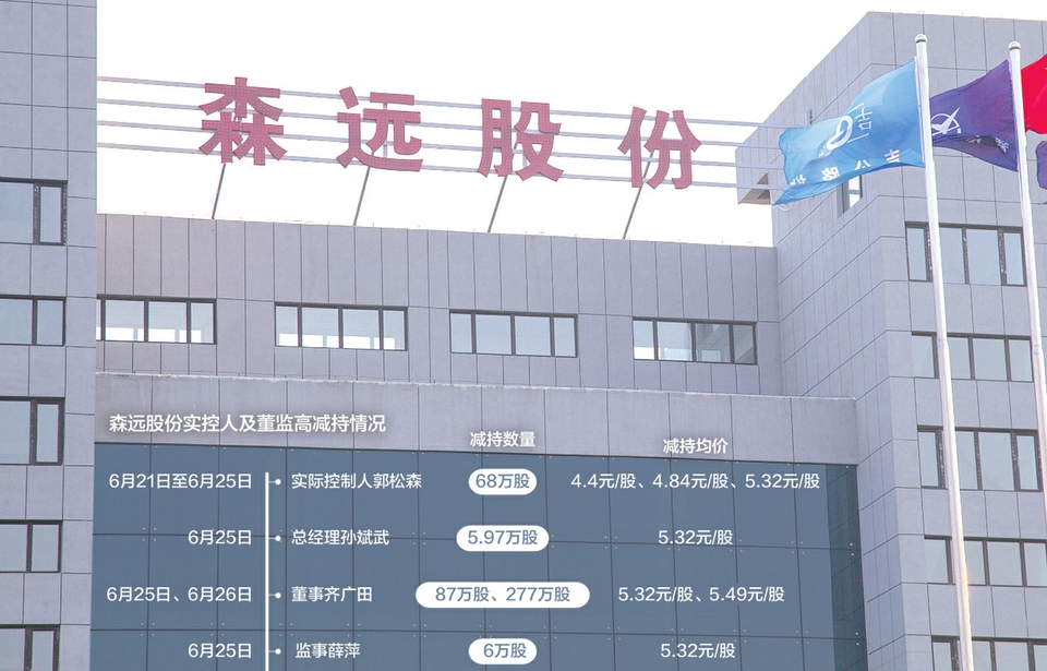 森远股份实际控制人郭松森自6月21日至6月25日期间,通过二级市场直接减持了68万股,减持均价分别为4.4元/股、4.84元/股、5.32元/股;森远股份总经理孙斌武6月25日减持了5.97万股,减持均价为5.32元/股;森远股份董事齐广田6月25日、6月26日分别减持了87万股、277万股;森远股份监事薛萍在6月25日减持了6万股,减持均价5.32元/股。