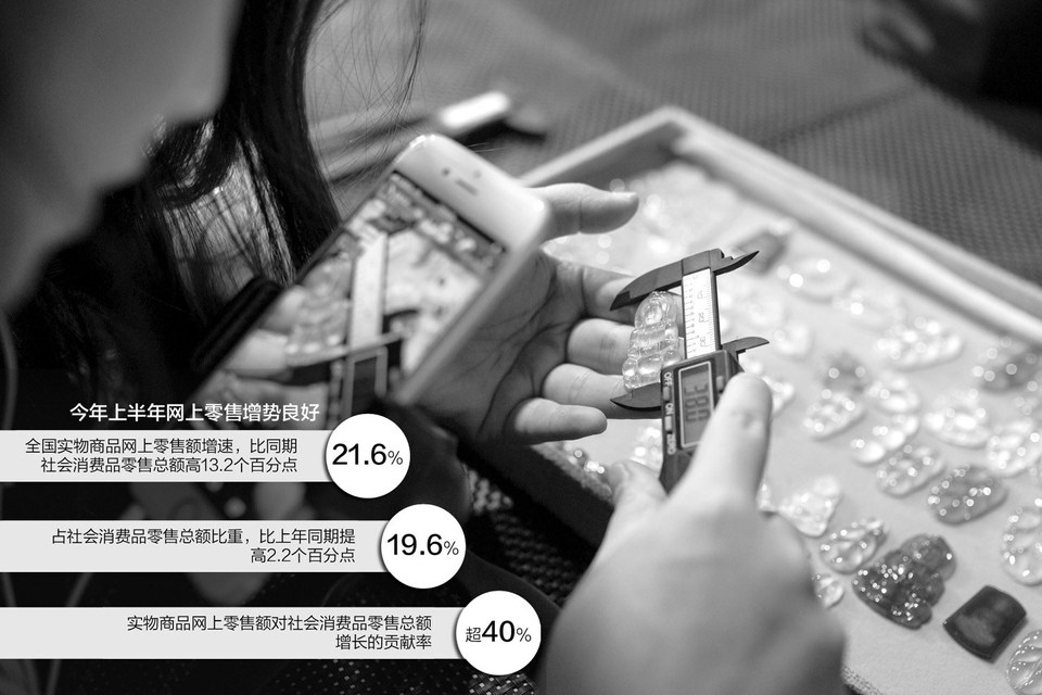 国家统计局贸易外经司司长蔺涛在解读宏观经济“半年报”时提到,在互联网特别是移动互联网普及率不断提升、网民规模持续扩大以及城乡物流配送体系日益完善等因素的支撑下,网上零售增势良好。今年上半年,全国实物商品网上零售额增长21.6%,增速比同期社会消费品零售总额高13.2个百分点,占社会消费品零售总额的比重为19.6%,比上年同期提高2.2个百分点;实物商品网上零售额对社会消费品零售总额增长的贡献率超过40%。