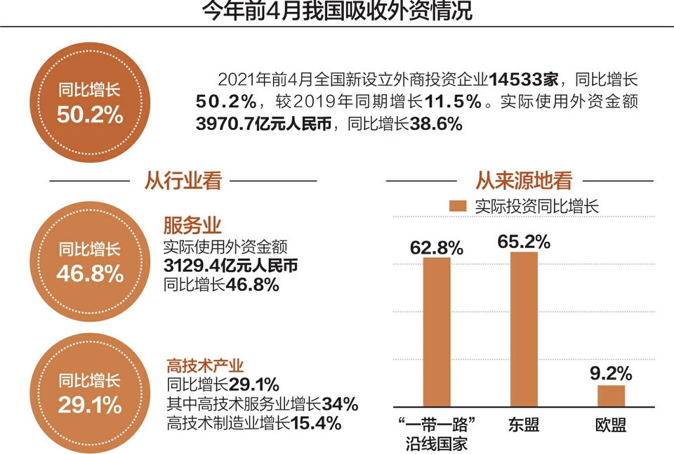高峰在例行新闻发布会上介绍,今年前4个月,从行业看,服务业实际使用外资金额3129.4亿元人民币,同比增长46.8%。高技术产业增长29.1%,其中高技术服务业增长34%,高技术制造业增长15.4%。从来源地看,“一带一路”沿线国家、东盟、欧盟实际投资同比分别增长62.8%、65.2%、9.2%(含通过自由港投资数据)。从区域分布看,我国东部、中部、西部地区实际使用外资分别增长39.1%、37.5%和30.3%。