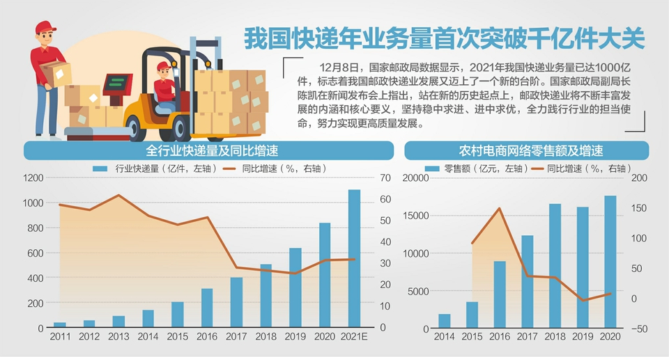 12月8日,国家邮政局快递大数据平台实时监测数据显示,2021年我国快递业务量已达1000亿件,这也是我国快递年业务量首次突破千亿件大关。另外两个关键数字是,我国快递业务量连续8年稳居世界第一,日均服务用户近7亿人次。