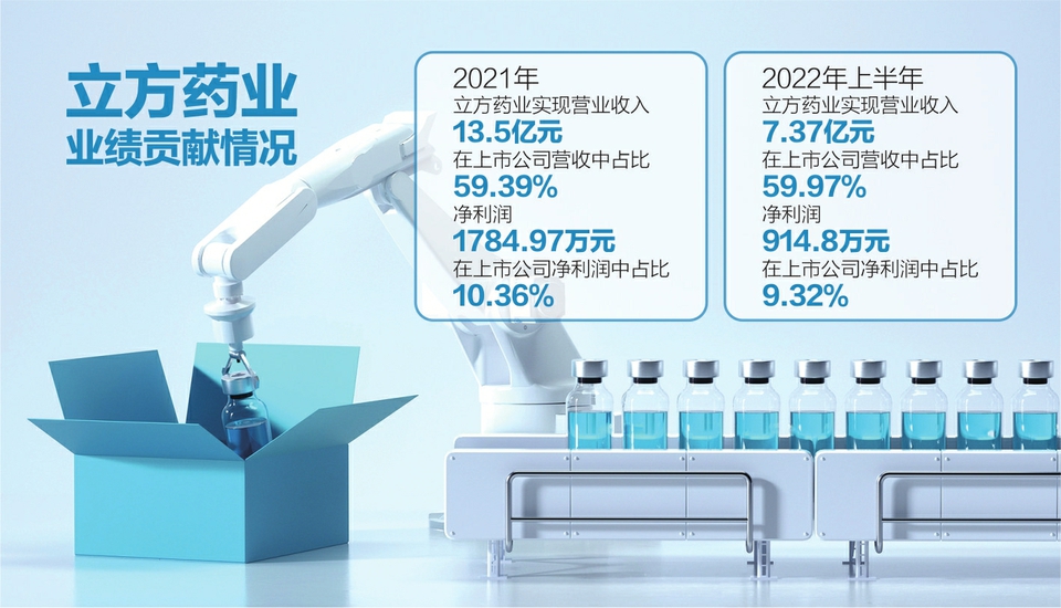 数据显示,2021年,立方药业实现营业收入13.5亿元,净利润1784.97万元,在上市公司营收、净利润中占比分别为59.39%、10.36%;2022年上半年,立方药业实现营业收入7.37亿元,净利润914.8万元,在上市公司营收、净利润中占比分别为59.97%、9.32%。