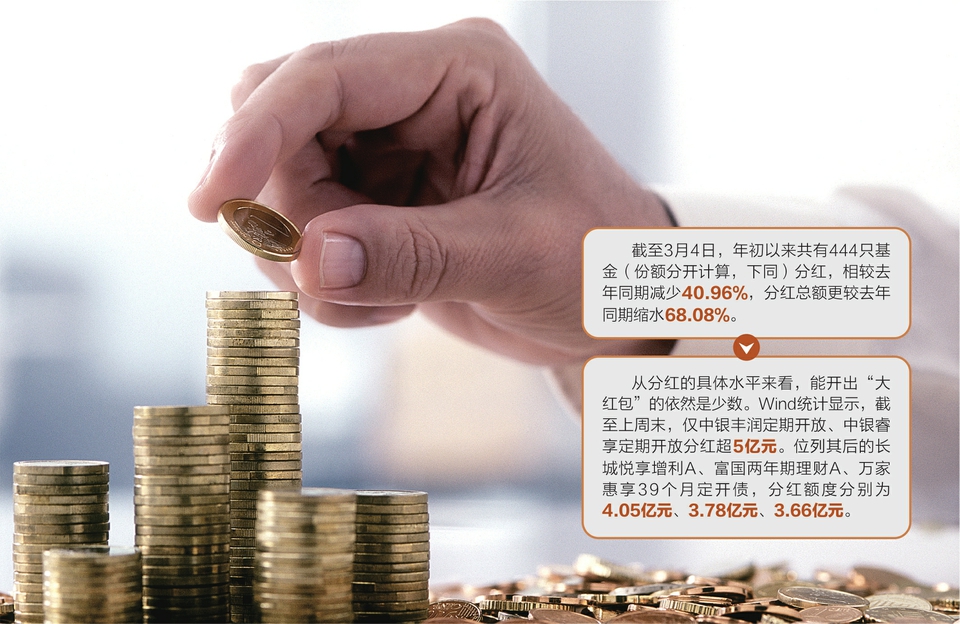 公开数据显示,截至3月4日,年初以来共有444只基金(份额分开计算,下同)分红,相较去年同期减少40.96%。此外,分红总额更较去年同期缩水68.08%。需要指出的是,债券基金成为开年以来基金分红的主力,在所有分红基金中占比较多。