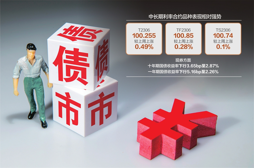 对应债市的周内变化,整体处于上行态势,中长期利率合约品种表现相对强势。截至上周五收盘,T2306收为100.255,较上一周上涨0.49%;TF2306收为100.85,较此前一周上涨0.28%;TS2306收为100.74,上涨0.1%。现券方面,十年期国债收益率下行3.65bp至2.87%,一年期国债收益率下行5.16bp至2.26%。