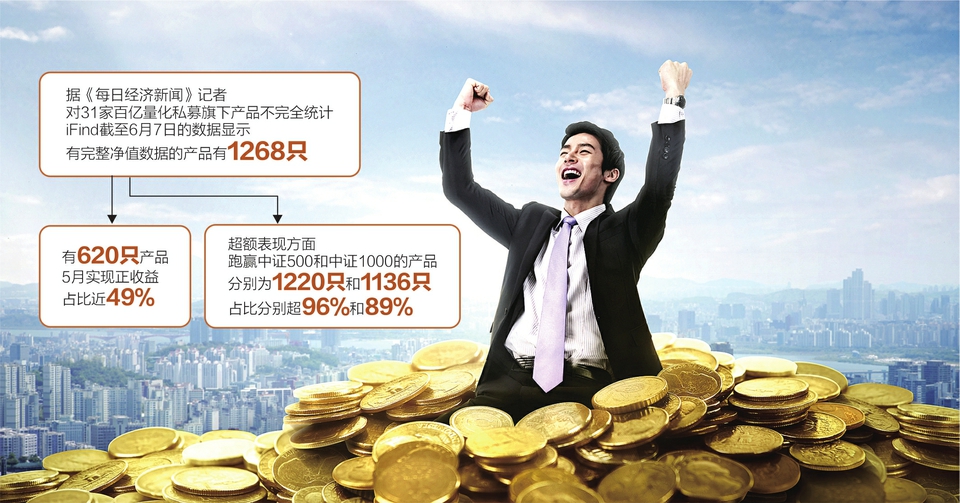 百亿量化私募方面,在主要股指大跌背景下,5月正收益产品竟然将近一半,跑赢中证1000产品占比更是高达89%,1200多只产品仅1只产品跑输沪深300。