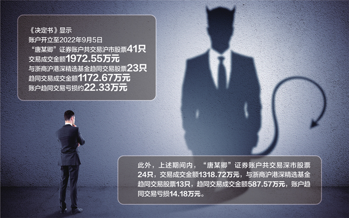 《决定书》显示,账户开立至2022年9月5日,“唐某卿”证券账户共交易沪市股票41只,交易成交金额1972.55万元,与浙商沪港深精选基金趋同交易股票23只,趋同交易成交金额1172.67万元,趋同交易股票只数占比56.1%,趋同交易金额占比59.45%,账户趋同交易亏损约22.33万元。