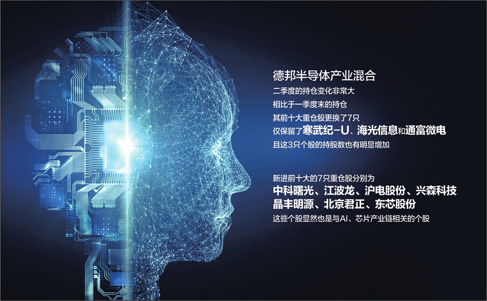 除了规模上的变动,记者还注意到,德邦半导体产业混合二季度的持仓变化也非常大,相比于一季度末的持仓,其前十大重仓股更换了7只,仅保留了寒武纪-U、海光信息和通富微电,且这3只个股的持股数也有明显增加。