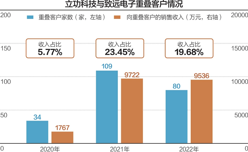 业务方面,2020~2022年,立功科技与致远电子重叠客户家数分别达到34家、109家以及80家,致远电子向重叠客户的销售收入分别是1766.84万元、9722.38万元以及9535.98万元,收入占比分别是5.77%、23.45%以及19.68%。