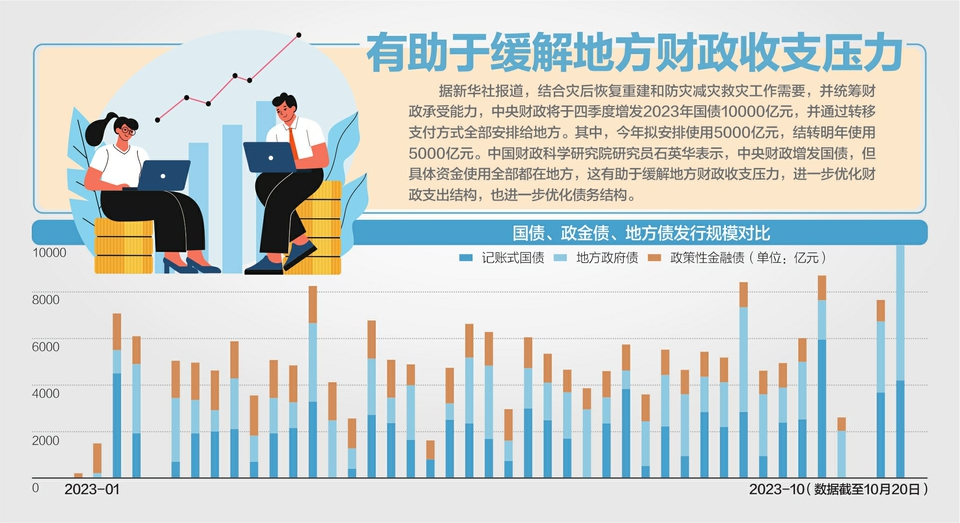 据了解,结合灾后恢复重建和防灾减灾救灾工作需要,并统筹财政承受能力,中央财政将于四季度增发2023年国债10000亿元,并通过转移支付方式全部安排给地方。其中,今年拟安排使用5000亿元,结转明年使用5000亿元。