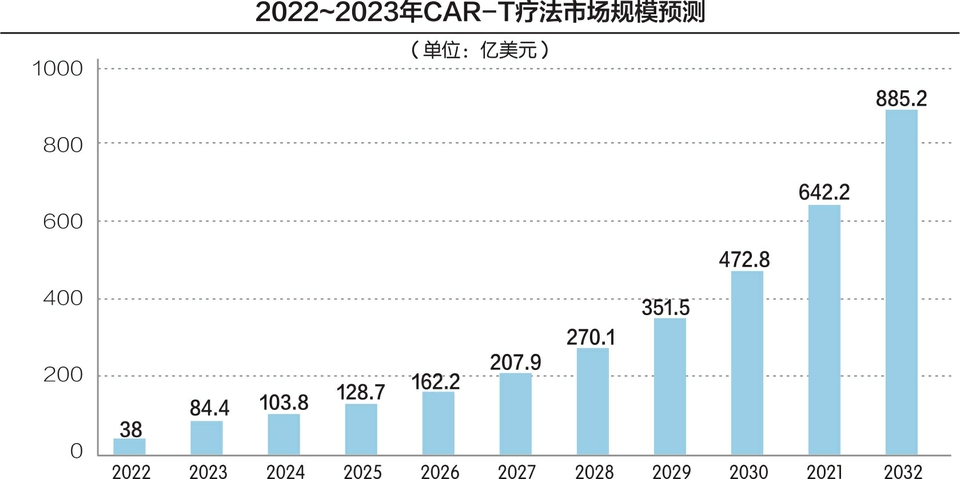 根据国外研究公司Precedence Research的数据,2022年全球CAR-T细胞治疗市场规模为38亿美元,预计到2032年将达到885.2亿美元左右,2023年至2032年复合年增长率将高达29.8%。
