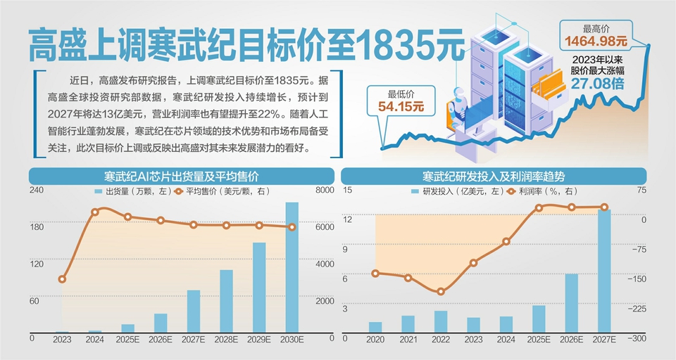 同时,在半年报的风险提示中,寒武纪也直言近期股价上涨背后存在市场不实传言,并提醒投资者理性看待股价波动。8月20日,寒武纪股价突破1000元大关,25日最高冲至1391元。8月27日盘中,寒武纪股价最高上摸1464.98元,一度超过贵州茅台(SH600519,股价1448.61元,市值1.82万亿元),成为A股股价最高的个股。
