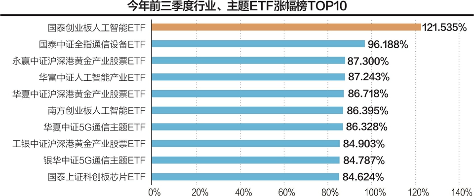 其中,国泰创业板人工智能ETF以121.53%的涨幅领跑,同时成为股票型ETF今年前三季度的收益冠军,最新规模为2.72亿元;国泰中证全指通信设备ETF和永赢中证沪深港黄金产业股票ETF分别大涨96.19%和87.3%,分别位居涨幅榜第二、第三,这两只ETF规模较大,分别达到115.52亿元和116.69亿元;第四名华富中证人工智能产业ETF和第七名华夏中证5G通信主题ETF的规模也较大,分别达到80.79亿元和96.4亿元,今年以来均涨超86%。