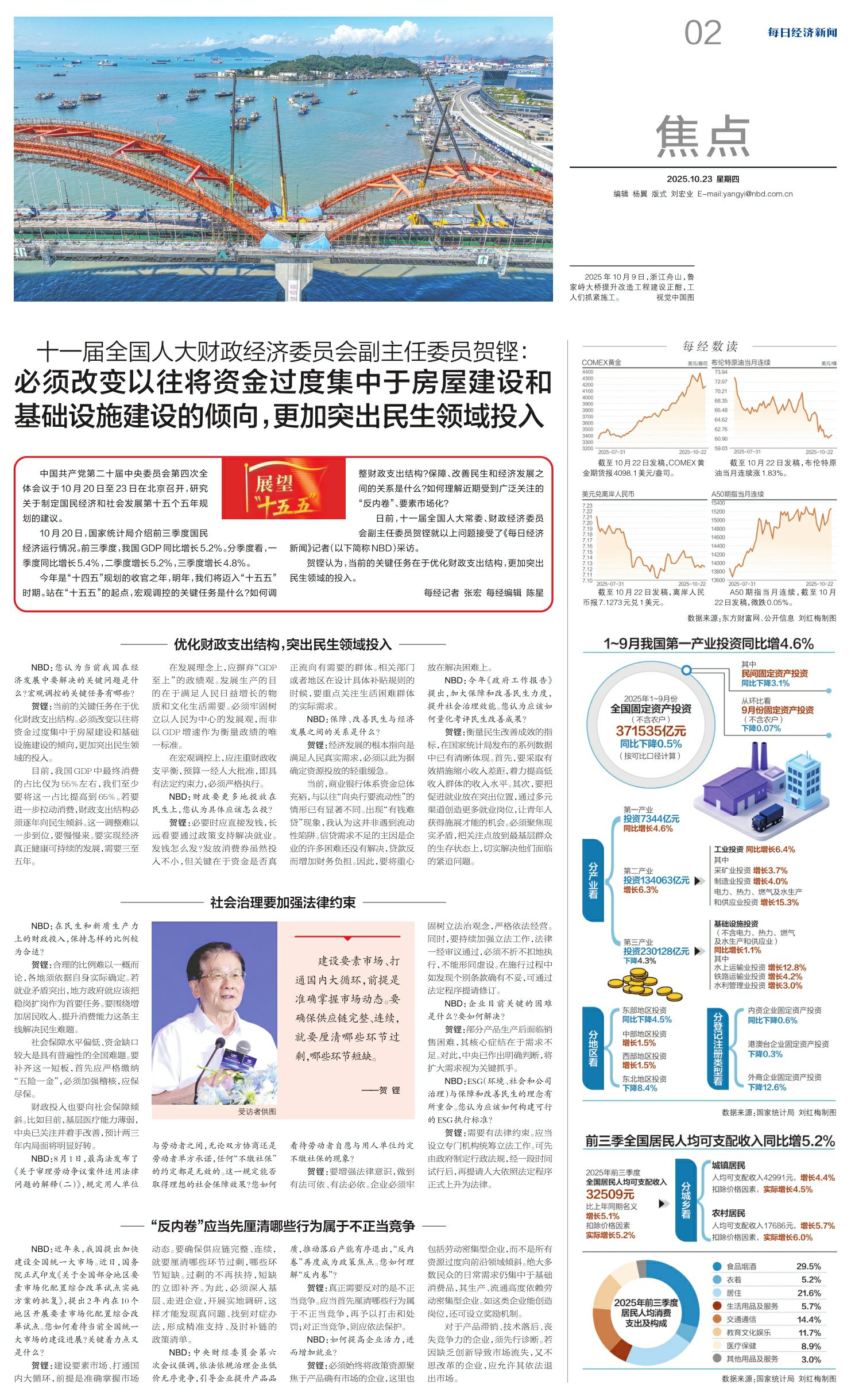 十一届全国人大财政经济委员会副主任委员贺铿:必须改变以往将资金过度集中于房屋建设和基础设施建设的倾向,更加突出民生领域投入