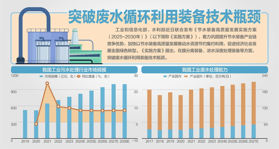 在用水装备方面,上述业内专家提到,围绕工业清洗和循环冷却两大高耗水环节,《实施方案》提出了针对性举措。洗涤装备重点发展高压喷淋、多功能集成清洗和分级回用技术,探索超临界清洗等前沿技术。循环冷却装备则注重效能提升和能源协同,通过结构优化、材料创新和智能控制,提高换热效率和浓缩倍数,并前瞻布局相变储能冷却技术。