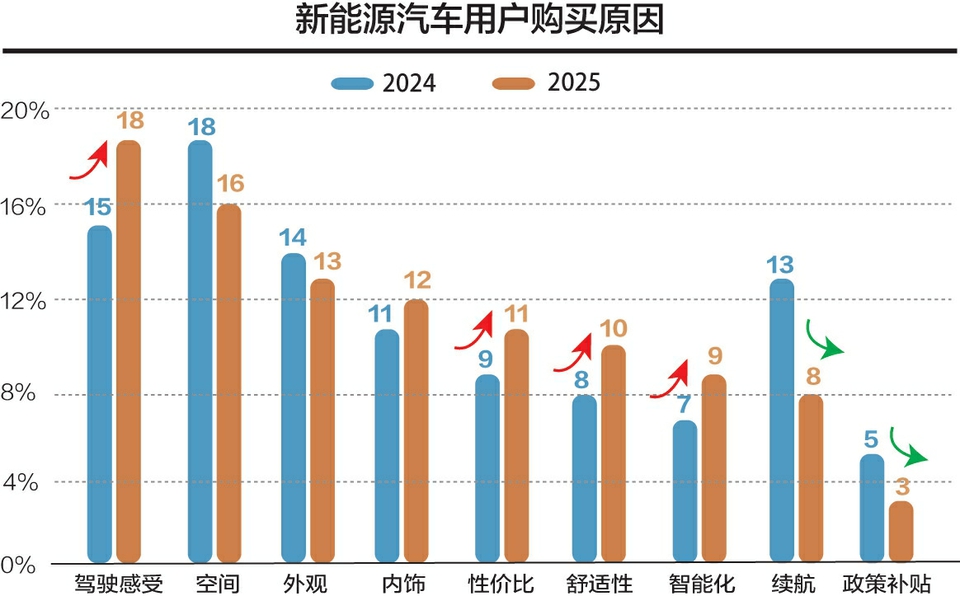 值得注意的是,这一车市特点不仅体现在宏观销售数据的量变,更深刻反映在用户购车决策逻辑的质变上。“报告”显示,在用户购车动机中,续航里程和补贴政策等因素占比显著下降,而驾驶感受、舒适性及智能化配置已跃升为核心驱动力。具体来看,上述三项因素在购买动因中分别占据18%、10%和9%的权重。