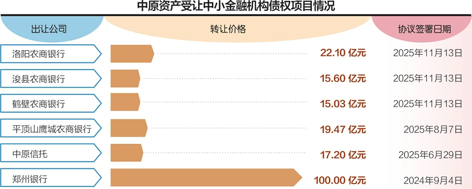 近日,中原资产管理有限公司(以下简称中原资产)发布公告称,公司于2025年11月13日与洛阳农商银行、浚县农商银行和鹤壁农商银行签署《不良资产转让协议》,3家银行分别向中原资产转让不良资产,转让价款分别为22.10亿元、15.60亿元和15.03亿元,合同已生效。