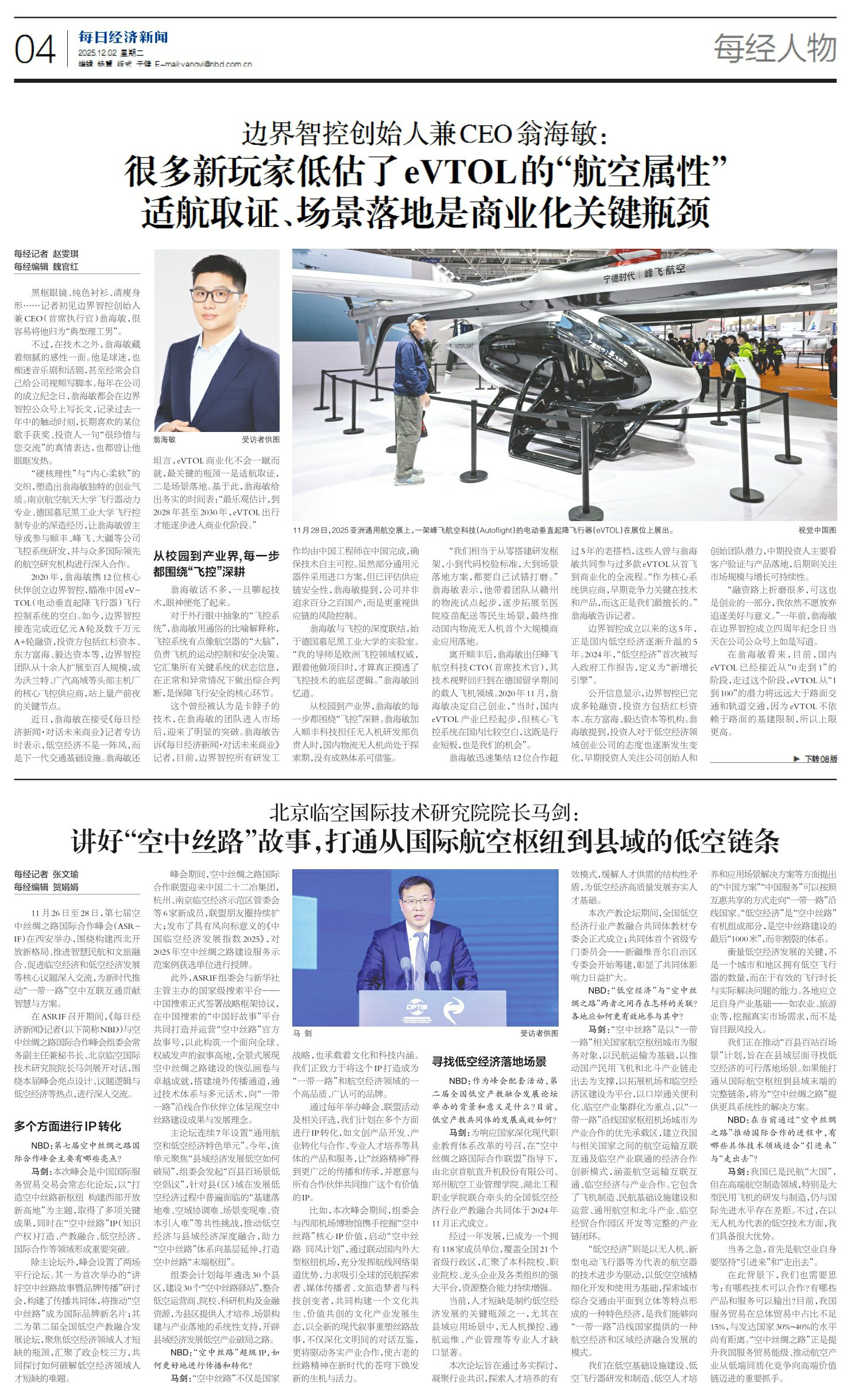 边界智控创始人兼CEO翁海敏:很多新玩家低估了eVTOL的“航空属性” 适航取证、场景落地是商业化关键瓶颈