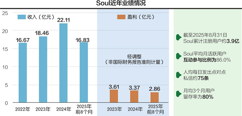用户数据方面,截至2025年8月31日,Soul累计注册用户约3.9亿。此外,Soul平均月活跃用户互动参与比例为86.0%,人均每日发出点对点私信约75条;月均3个月用户留存率为80%。
