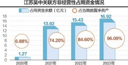 在2020年至2023年历年间的报告期末,江苏吴中关联方非经营性占用资金余额分别为1.27亿元、13.92亿元、15.43亿元、16.92亿元,占当期披露净资产的6.88%、74.20%、84.60%、96.09%。