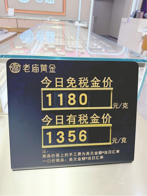 老庙黄金价格展示牌显示,当天免税金价为1180元/克,有税金价为1356元/克,免税价便宜176元/克。