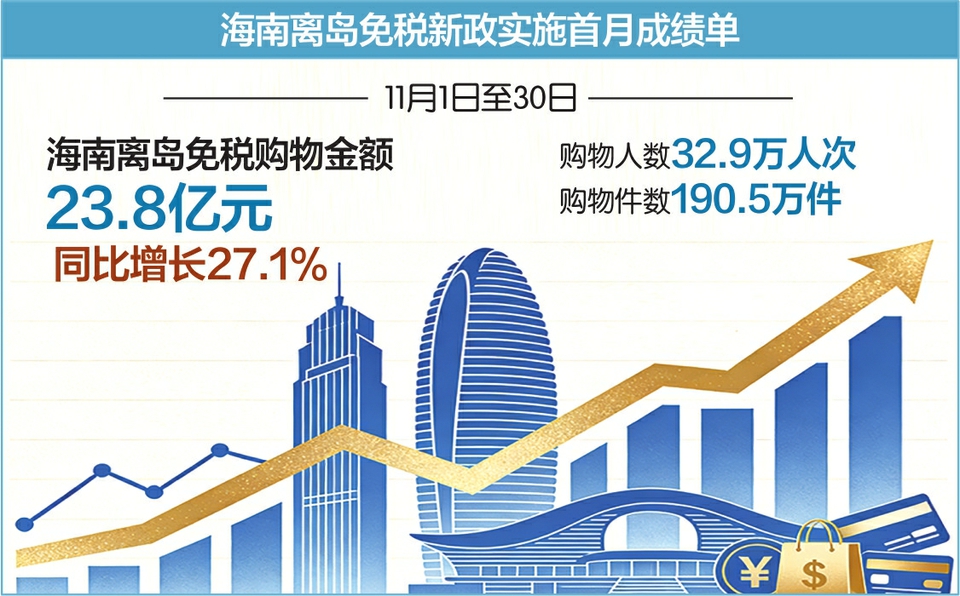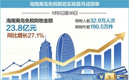 11月1日,海南离岛免税购物新政正式实施。每经记者了解到,海口海关统计数据显示,11月1日至30日,海南离岛免税购物金额23.8亿元,同比增长27.1%,购物人数32.9万人次,件数190.5万件。