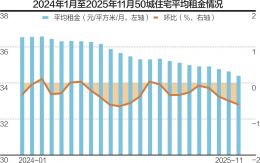 值得注意的是,尽管在房价下调的背景下,重点城市租金收益率有所提高,但房屋租金也在回调。据中指研究院统计,2025年前11个月,全国重点50城住宅租金累计跌幅达到3.04%,3月起租金连续下跌;11月,重点50城住宅平均租金为34.4元/平方米/月,环比下跌0.60%,同比下跌3.57%。