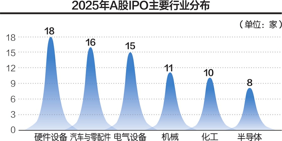 从上市新股的行业分布来看,按照Wind行业来划分,2025年上市新股更多来自硬件设备、汽车与零配件、电气设备、机械、化工和半导体行业,分别有18只、16只、15只、11只、10只、8只。