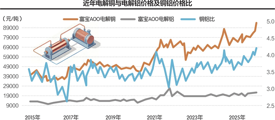 卓创资讯富宝金属分析师米延滨向记者表示,自2021年起,随着铜价攀升,铜铝比开始抬升,直至2025年抬升至平均3.89,较2015年扩大0.38。铜铝比的扩大,一方面是铜对铝的带动作用将加强;另一方面是铝对铜的替代范围将扩大。