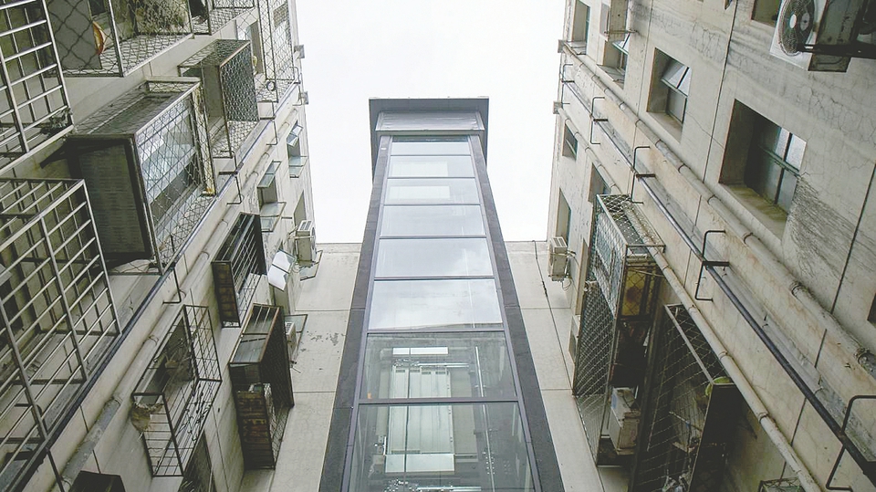 以双河南里小区第七单元为例,该单元楼梯间外有一个废弃的垃圾井道。通过拆除垃圾井道并扩凿洞口,在洞口外新建电梯井道,与楼梯间连廊连接实现平层入户。电梯井道基础为筏板基础,与原楼栋基础分开独立承重。井道采用钢结构,工厂拼装后运至现场整体吊装。井道与原楼体采用铰接方式相连,避免对原楼体产生附加弯矩。加装电梯投资额为49万元,其中财政补贴24万元,社会力量出资25万元。