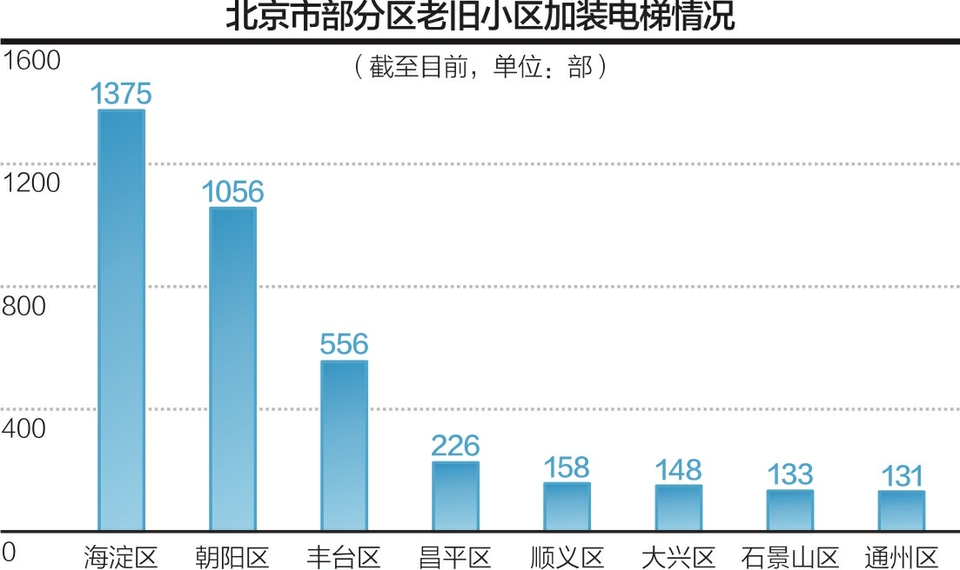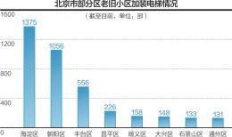 据《每日经济新闻》记者梳理,截至目前,北京市海淀区的老旧小区加装电梯数量最多,为1375部;朝阳区次之,为1056部;丰台区、大兴区、石景山区等区的加装数量也均在三位数。