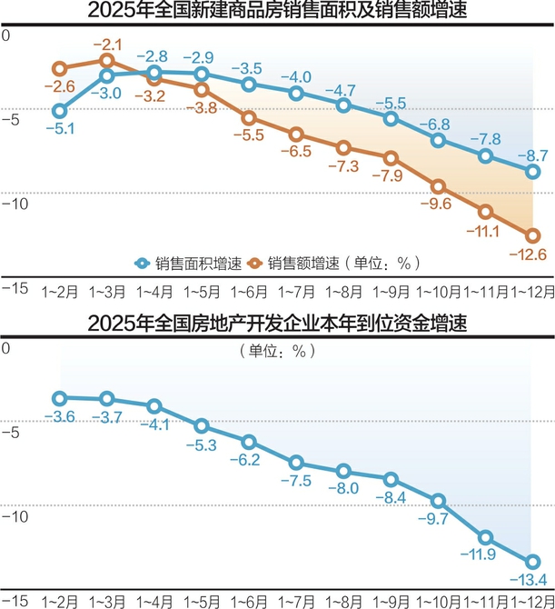 国家统计局公布的数据显示,2025年,全国房地产开发投资82788亿元(按可比口径计算),比2024年下降17.2%;其中,住宅投资63514亿元,下降16.3%。新建商品房销售面积88101万平方米,比2024年下降8.7%;其中住宅销售面积下降9.2%。新建商品房销售额83937亿元,下降12.6%;其中住宅销售额下降13.0%。