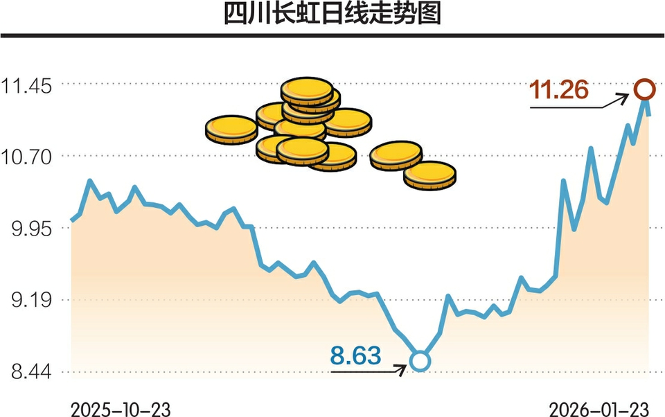 从每经品牌100指数成分股表现来看,四川长虹上周涨幅为8.04%。拉长时间看,进入2026年以来,该股股价已经实现周线“三连阳”,1月累计涨幅达到21.10%。