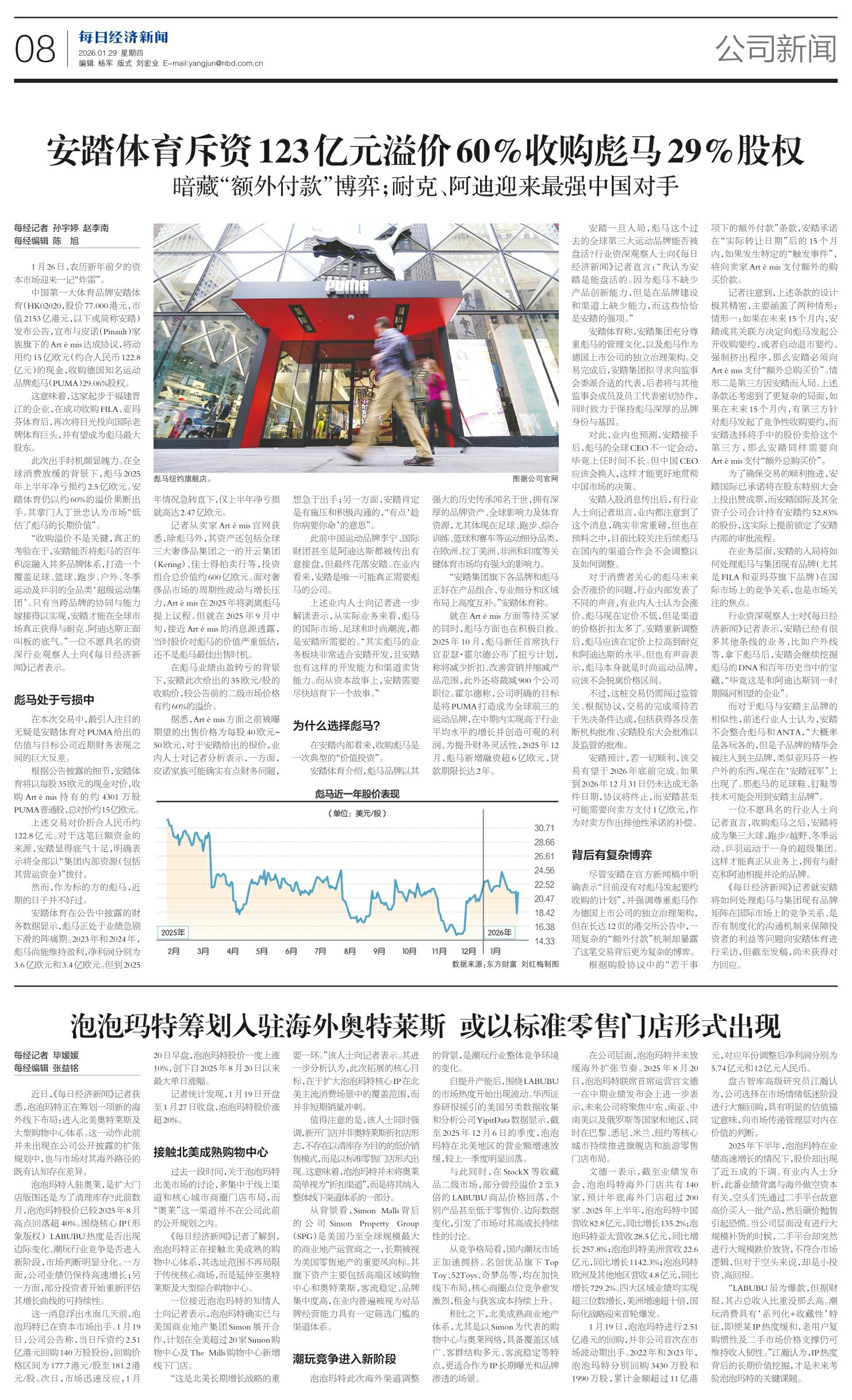 安踏体育斥资123亿元溢价60%收购彪马29%股权
