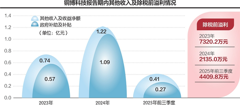招股书显示,2023年、2024年和2025年前三季度,铜博科技的其他收入及收益净额分别为7447.0万元、1.22亿元和4070.1万元,其中政府补助及补贴分别为5710.7万元、1.09亿元和2741.7万元,同期铜博科技的除税前溢利分别为7320.2万元、2135.0万元和4409.8万元。也就是说,铜博科技在报告期内的政府补助及补贴之和高于除税前溢利之和。尤其是在2024年,铜博科技的政府补助及补贴是除税前溢利的约5倍。