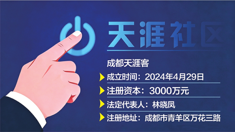 记者查询天眼查发现,成都天涯客成立于2024年4月29日,注册资本3000万元,法定代表人为林晓凤,注册地位于成都市青羊区万花三路。