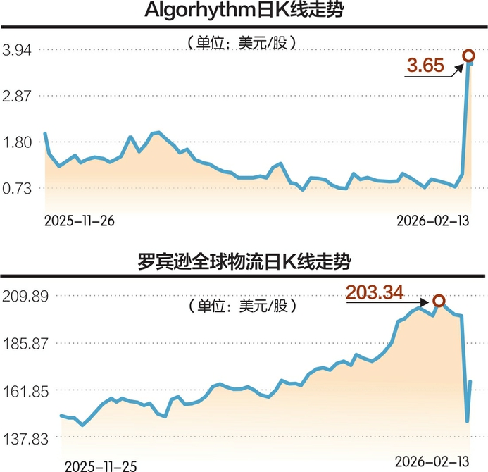 Algorhythm公司于2024年全面转型做AI物流,并于2025年收购SemiCab。以市值剧烈震荡前的最后一个交易日2月11日收盘价计算,Algorhythm市值约3300万元,与市值1600亿元的罗宾逊全球物流和市值383亿元的莱帝运输相比,属于该板块的微型企业。但就是这样一家不起眼的小公司,却通过AI在一夜之间便击破了传统物流行业的“护城河”。