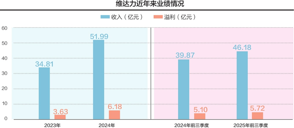 从业绩表现来看,2023年、2024年、2024年前三季度和2025年前三季度,维达力的收入分别为34.81亿元、51.99亿元、39.87亿元和46.18亿元,其年/期内溢利分别为3.63亿元、6.18亿元、5.10亿元和5.72亿元。