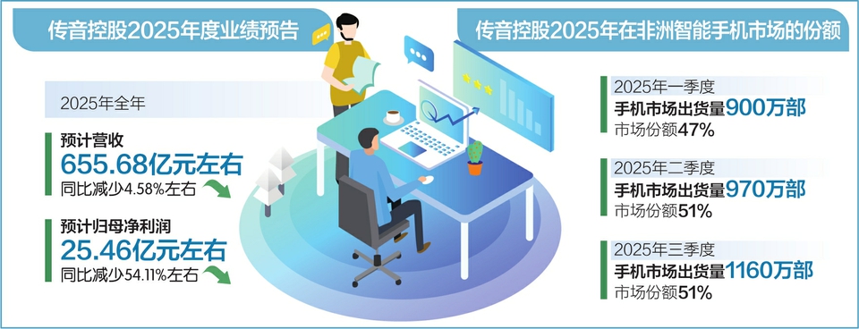 市场研究咨询机构Omdia的数据显示,2023年和2024年,传音控股在非洲智能手机市场的份额分别为50%和51%。2025年一至三季度,其在非洲智能手机市场的出货量分别为900万部、970万部和1160万部,对应市场份额为47%、51%和51%。这意味着,在非洲每售出两部手机,就有一部是传音品牌。