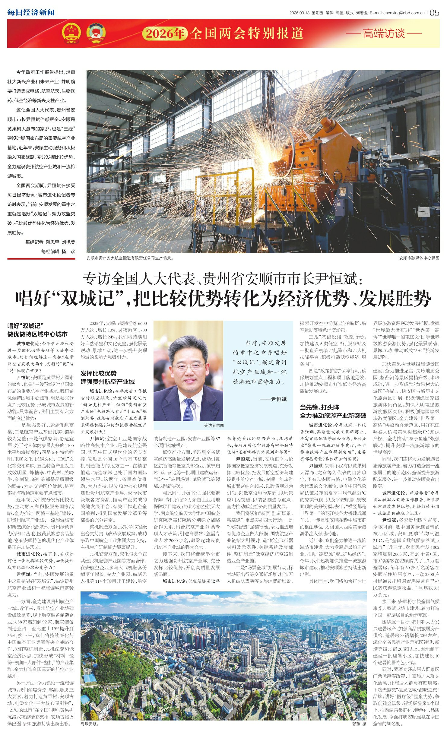 专访全国人大代表、贵州省安顺市市长尹恒斌:唱好“双城记”,把比较优势转化为经济优势、发展胜势