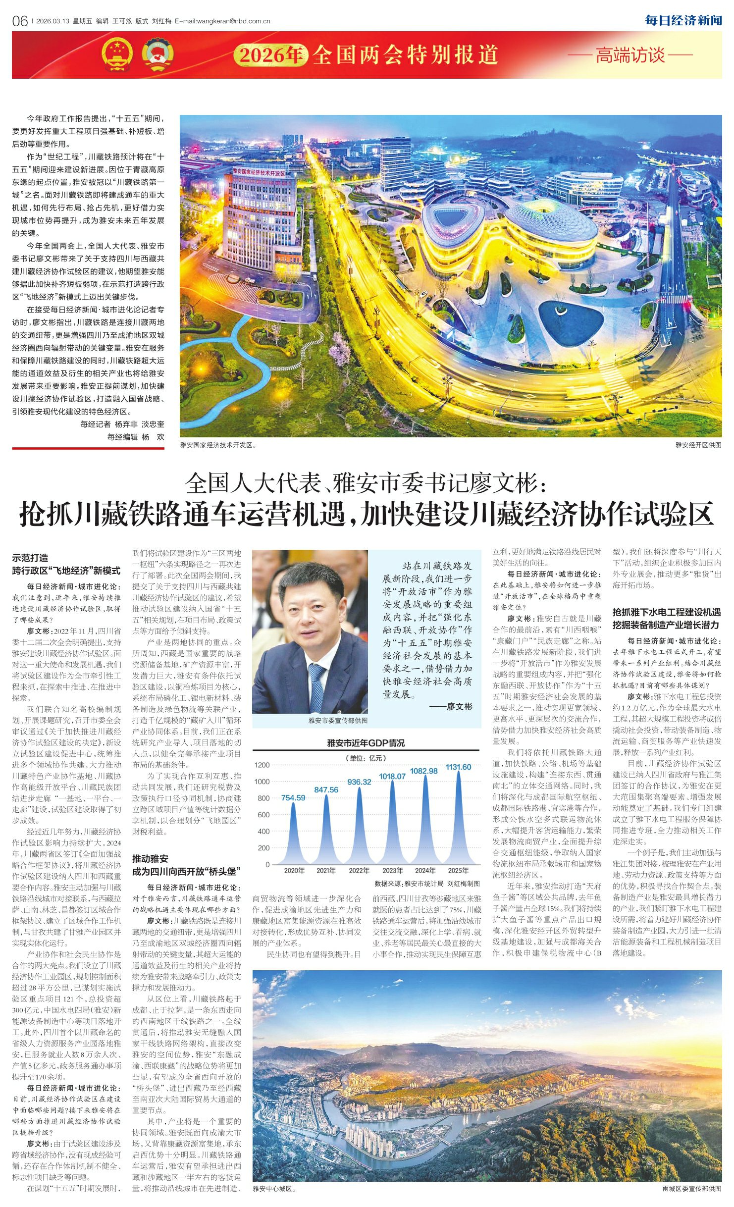 全国人大代表、雅安市委书记廖文彬:抢抓川藏铁路通车运营机遇,加快建设川藏经济协作试验区