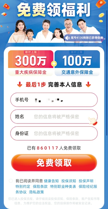 近日,每经记者在“安易保”平台体验了一次0元投保过程。页面有大字体提示输入手机号“免费领取”,领取的保障权益包含300万元重大疾病保障金和100万元交通意外保障金,均有小字提示“赔付上限”。页面显示,已有超86万人免费领取。保险经纪服务协议显示,中介机构为“湖北大同保险经纪有限公司”。