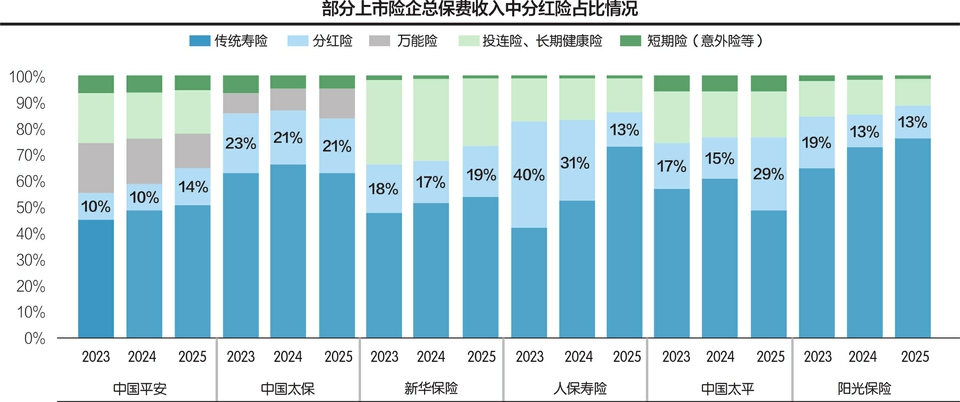 尽管新单市场被分红险快速渗透,但从总保费收入(新单+续期)结构看,非分红型的传统险依旧是五大险企的“压舱石”。