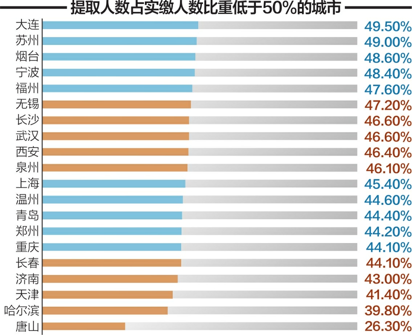 数据显示,33座主要城市中,除济南、深圳、常州等少数城市提取率较上年增长外,其余23座城市均有不同程度下降。提取率下降最多的是哈尔滨,从上年90.2%骤降至69.53%,减少超过20个百分点。