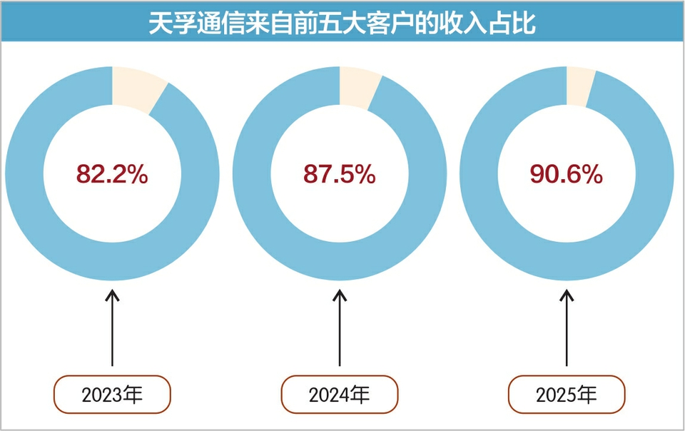 在光通信器件行业,大客户订单的获取能力直接决定了企业的营收体量。招股书数据显示,2023年、2024年和2025年(以下简称报告期内),天孚通信来自前五大客户的收入占比分别达82.2%、87.5%和90.6%。