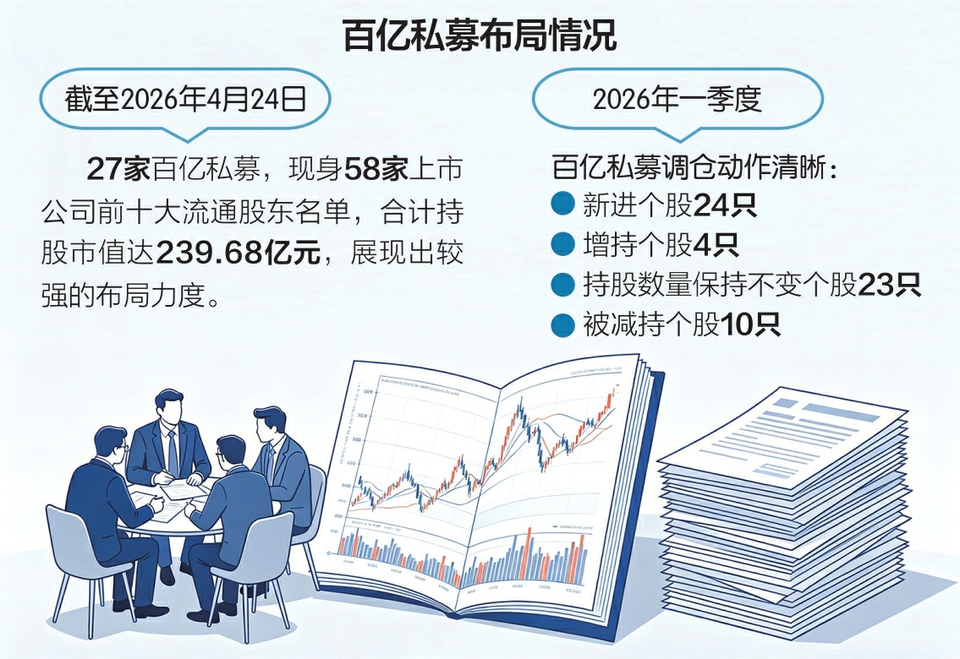 据私募排排网统计,截至2026年4月24日,27家百亿私募现身58家上市公司前十大流通股东名单,持股市值合计239.68亿元,展现出较强的布局力度。