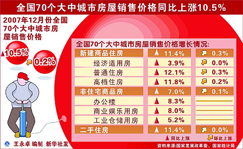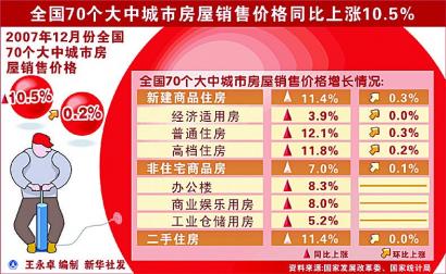 国家发展改革委、国家统计局最新调查数据显示,2007年12月,全国70个大中城市房屋销售价格同比上涨10.5%,涨幅与上月持平;环比上涨0.2%,涨幅比上月降低0.6个百分点(见图)。