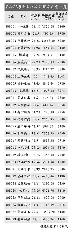 据Wind资讯统计,首批28家创业板公司总计12.22亿限售股将在11月1日解禁。